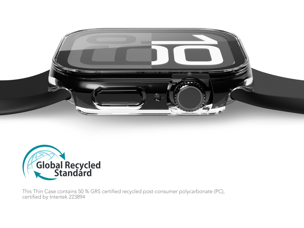 De Thin Case is verkrijgbaar in verschillende kleuren en past op meerdere smartwatch-formaten. Dankzij het gebruik van meer dan 50% GRS-gecertificeerde gerecyclede materialen combineert deze beschermhoes bescherming met een bewuste keuze voor duurzaamheid.