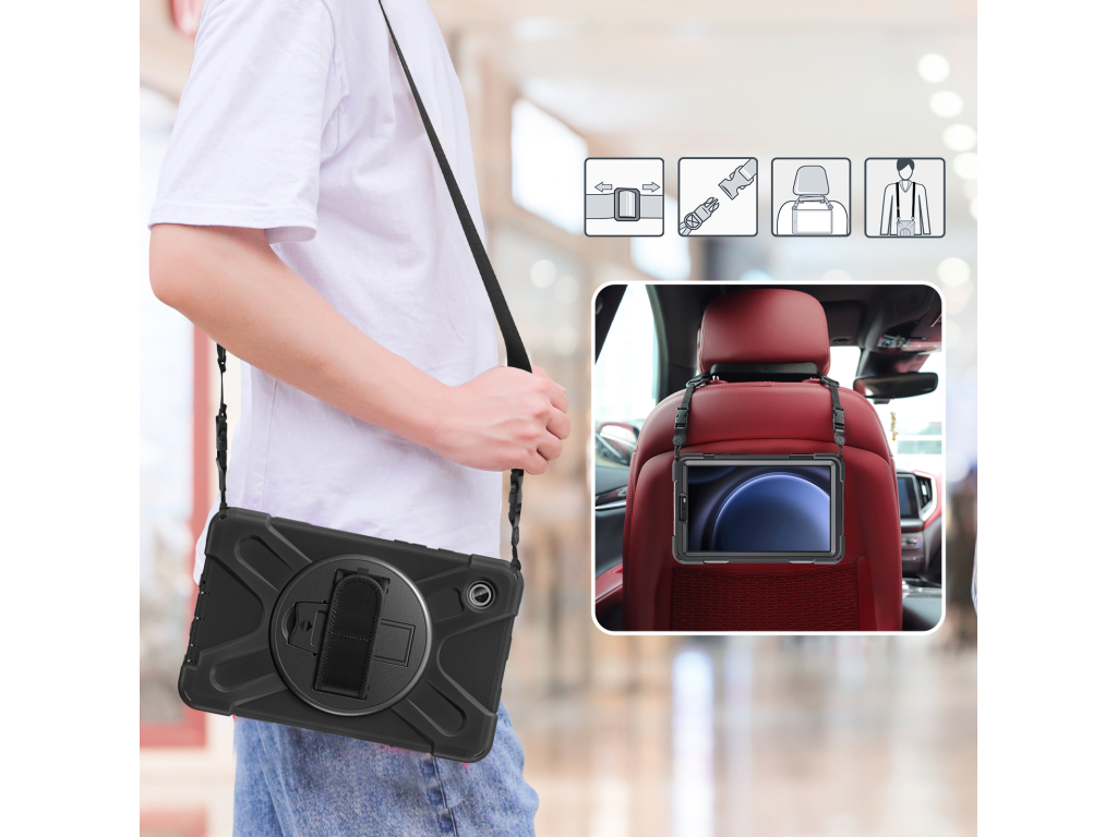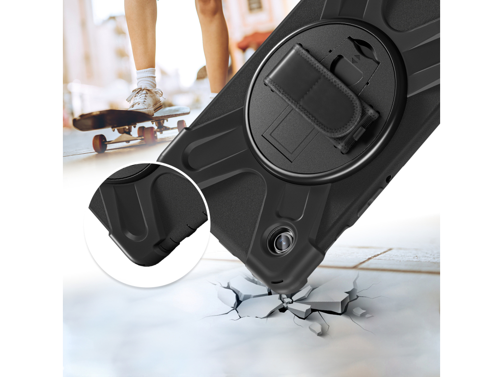 Met de Xccess Survivor All-round Case bent u van alle gemakken voorzien. De case is gemaakt uit een basis van hard plastic, met een rubberen afwerking. Zo vangt de case eventuele klappen en stoten op als de tablet per ongeluk valt. Gelukkig zal dit niet snel gebeuren, dankzij de Hand Strap op de achterzijde. Deze strap zorgt ervoor dat u de tablet goed vast kunt houden. Middels het klittenband is de strap goed strak te trekken om elke hand. Deze strap bevindt zich op een 360° draaibare schijf, zodat u de tablet in zowel landscape als portrait stand wilt gebruiken. Daarnaast kunt u de tablet als schoudertas dragen dankzij het bijgeleverde koord. Achter de Hand Strap is bovendien nog een handige standaard te vinden, zodat u comfortabel naar video's kunt kijken.