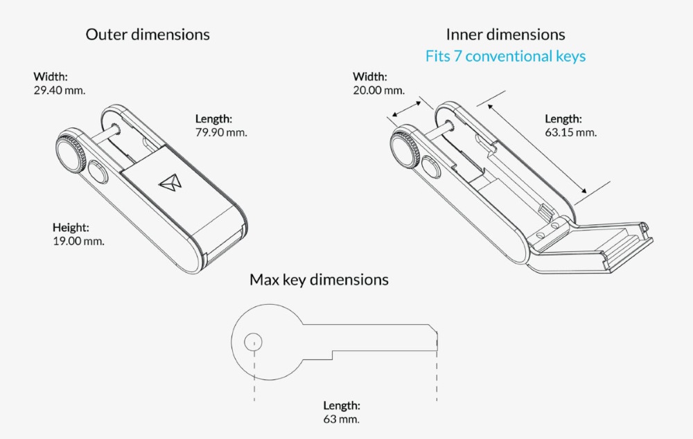 - Dit past: Sleutels van het oog tot eind: max 63 mm (zie de afbeelding)